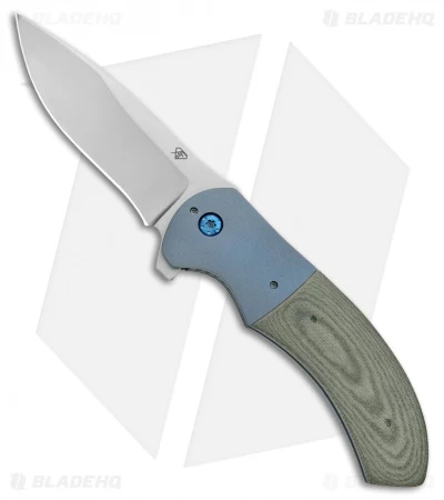 This Custom Rictor flipper knife from Aaron Frederick offers a solid EDC design with OD green micarta scales and blue titanium bolsters over sturdy titanium liners. The CPM-154 stainless steel drop point blade is tumbled and expertly sharpened. Item comes fitted with an anodized titanium pocket clip and blue ano Steve Kelly hardware.