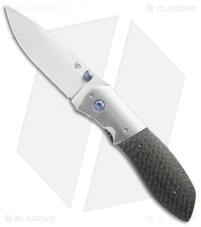 This Custom Mathor folding knife from Aaron Frederick offers a solid EDC design with lightning strike carbon fiber scales and nickel bolsters over sturdy titanium liners and a blue anodized titanium backspacer. The CPM-154 stainless steel drop point blade is hand finished and expertly sharpened. Comes fitted with a titanium pocket clip for secure carry.