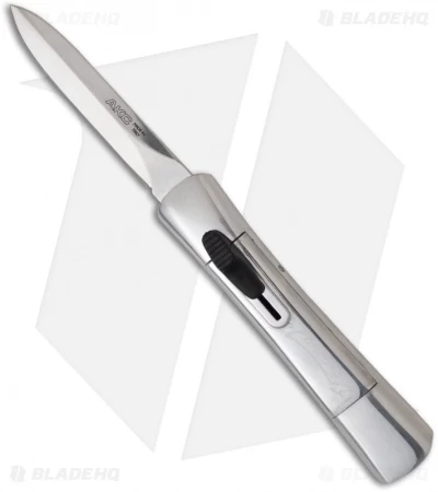 This model is equipped with a satin finished, double-edge dagger blade, and a silver finished aluminum handle.