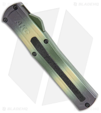 The AKC F-20 is a lightweight, mid-size OTF automatic knife from the Italian company AKC. These knives are made from aluminum with a sandpaper inlay for grip. The dual-action thumb slide has jimping for texture. The firing action is satisfying and powerful! This is a lot of knife for the price!