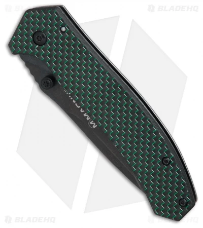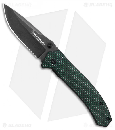 Pick up sophisticated style and EDC practicality with the Boker Magnum Green Strike frame lock knife. This model is built with a 440A stainless steel blade with dual thumb stud openers. The elegant handle sports a green lightning strike carbon fiber and G-10 scale that adds class and style to the design. A stainless steel frame lock provides solid blade lock up for safe use. Item includes a deep carry pocket clip.