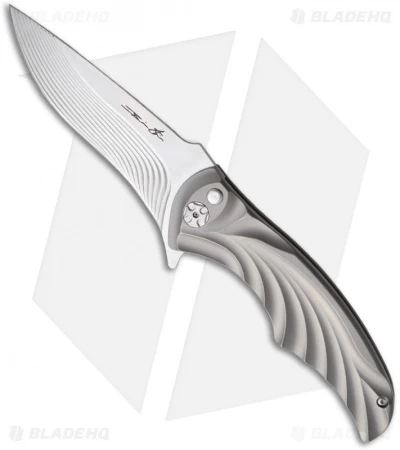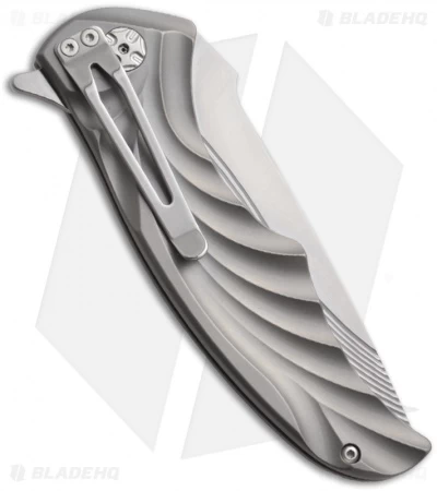 This Tighe Coon knife features a fluted titanium handle with a matte finish and an open build design. The hardware, pocket clip and button lock are satin finished. The drop point blade is fluted stainless steel with an integrated flipper. This Tighe Coon comes in a padded nylon pouch.
