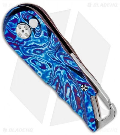 This Brian Tighe Custom Tighe Nee is a compact automatic knife with a built-in carabiner clip for carry convenience. It sports a polished Damasteel spear point blade that measures just under 2-inches. The handle is made from lightweight, eye-catching Timascus with a grooved pattern for added grip. Comes in a padded zipper pouch.