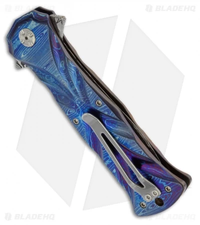 The custom Tighe Breaker folder features Brian Tighe’s signature fluting on the blade and handle. The Timascus frame is gorgeous! The Damasteel blade has an appealing recurve profile. Satin hardware and a tip-up carry pocket clip. The blade opens with precision using the thumb studs or flipper and is released by pushing the button lock. This fine knife is yet another great example of Brian Tighe’s fine work.