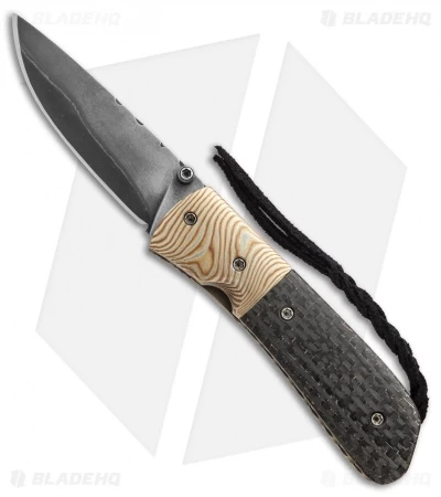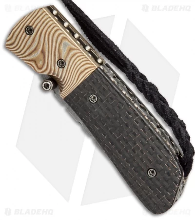 This Burr Oak C-MO folding knife has a 416/52100 San Mai steel blade with a thumb stud opener. The handle features Mokume bolsters and lightning strike carbon fiber scales over titanium liners. The steel back spacer is filed, along with the liners and blade spine. Comes fitted with a bronzed titanium pocket clip. This knife includes a signed certificate of authenticity.
