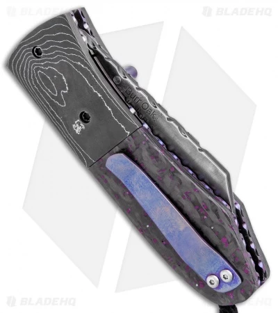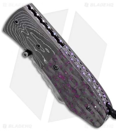 This Mini Combat Utility knife features a San Mai steel wharncliffe style blade with a thumb stud opener. The handle sports carbon fiber/sugilite scales and a damascus bolster over purple anodized titanium liners. Filework on the liners and spine finish off this impressively intricate design. This knife comes with a signed certificate of authenticity, dated 6/8/19.