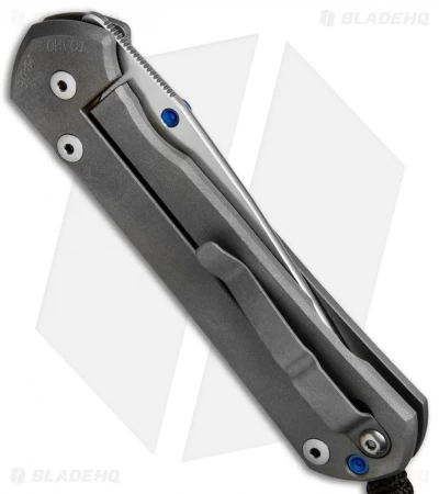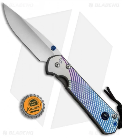 This Large Sebenza 21 features a satin finished titanium handle face with a Unique Graphic and a Blue Sapphire Cabochon. The frame lock and pocket clip are bead blast finished with a blue anodized finished thumb lug and spacer. This Sebenza has a satin finished S35VN stainless steel blade. Includes lanyard and leather pouch.
