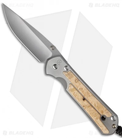 This Large Sebenza 21 model features a polished S35VN stainless steel blade with double thumb lugs and a satin finished titanium handle with Box Elder Burl inlays. Polished gold thumb lugs and spacer are chosen to coordinate with the color of the inlay. The frame lock and pocket clip are bead blast finished titanium.