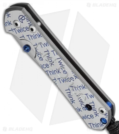 This Small Sebenza 21 features a satin finished titanium handle face with a “Think Twice, Cut Once” computer generated flag graphic (CGG). The framelock and pocket clip are bead blast finished. It is outfitted with a polished S35VN stainless steel blade with a blue thumb lug. Includes lanyard and leather pouch.