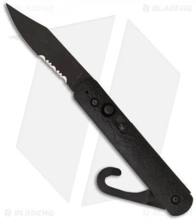 Automatic Rescue/Parachute Knife by Colonial Knife Company. The M-724 features a rescue hook and an automatic blade with a partially serrated edge. It is made for use in emergency survival conditions. The M-724 consists of a hook belt cutter blade on one end and an automatic blade on the other end. The blade is opened by a release button and held in place with a slide lock while the rescue hook has a nail nick for opening. The steel is 1095 HC and the handle is black ISOPLAST with sliding safety. This M-724 has a pocket clip!