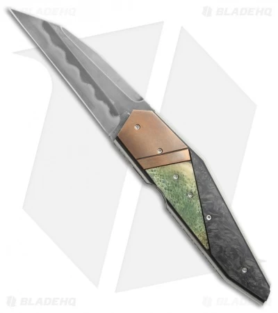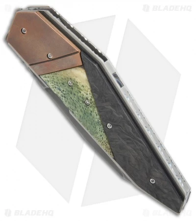 This Corrie Schoeman D-Fuse flipper knife has a green bone, marbled carbon fiber, and bronze handle. The blade has a Hamon finish.