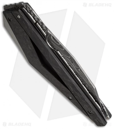 This Corrie Schoeman D-Fuse flipper knife has a marbled carbon fiber handle and a Damascus steel blade.