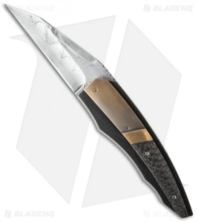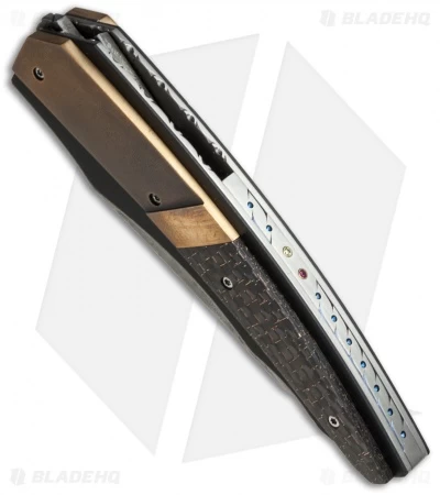 The D-TER flipper from Corrie Schoeman sports sleek lines and precision craftsmanship. This model has a heat treat formed Hamon finished 1095 steel blade. The ball-bearing pivot provides smooth, effortless action. It has a titanium liner lock handle with black G-10 onlays, lightning strike carbon fiber scales and bronze boslters. This knife has been embellished with filework on the blade spine, liners and back spacer, which is also adorned with ruby and cintrine inserts.