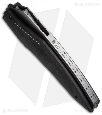 The D-TER flipper from Corrie Schoeman sports sleek lines and precision craftsmanship. This model has a damascus steel blade and marble carbon fiber scales. The ball-bearing pivot provides smooth, effortless action. It has a titanium liner lock handle with black G-10 underlays. This knife has been embellished with filework on the blade spine, liners and back spacer. A pearl inlay on the spine of the blade adds an elegant finishing touch to the piece.