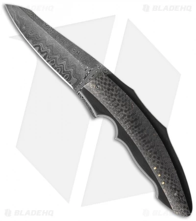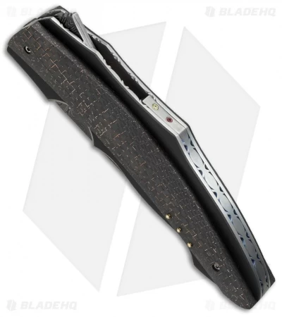 The Ilusion Flipper from Corrie Schoeman is an impressive folding knife design. It has a lightning strike carbon fiber handle over a thin black G-10 scale. The liners and titanium backstrap are filed and feature with Ruby & Citrine inserts on the spacer. The modified drop point style blade is Alabama Forge Damascus steel. The action on this knife is super smooth with a ball-bearing pivot and it has an excellent build.