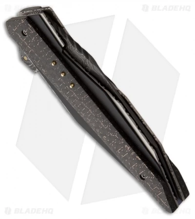 This N Able folder features lightning strike carbon fiber and G-10 over a titanium liner lock frame. The Damascus steel blade has a filed spine and citrine insert on the flipper. This knife has been embellished with filework on the liners and back spacer. The action on the N Able flipper is super smooth with a ball bearing pivot and excellent build.