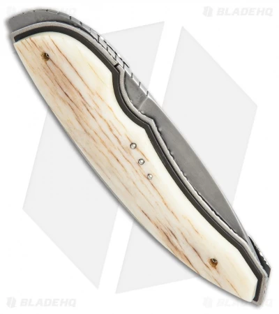 The Panerai Flipper knife from Corrie Schoeman is an impressive design. The handle features giraffe bone over a thin black G-10 scale. The liners and titanium backstrap are filed and feature an abalone insert on the spacer. The modified spear point style blade is 1095 steel that has been heat treated to form a Hamon blade. The action on this knife is super smooth with a caged ball-bearing pivot and it has an excellent build.