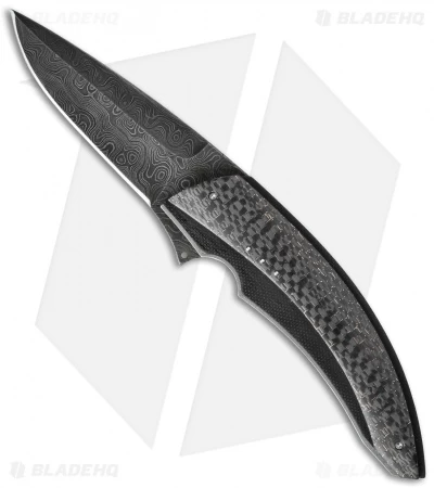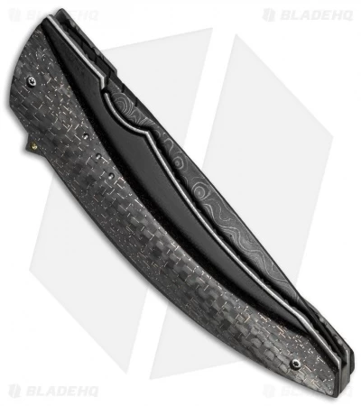 The Panerai Flipper knife from Corrie Schoeman is an impressive design. The handle features lightning strike carbon fiber over a thin black G-10 scale. The liners and titanium backstrap are filed and feature with Ruby & Citrine inserts on the spacer. The modified spear point style blade is Texas Steel Damascus with a filed spine and a citrine jewel insert on the flipper. The action on this knife is super smooth with a ball-bearing pivot and it has an excellent build.