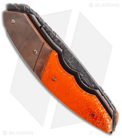 The Snout front flipper knife from Corrie Schoeman offers ultra clean lines and a modern aesthetic. This model has an Alabama forge damascus steel blade and orange impregnated giraffe bone inlays alongside bronze bolsters. The ball-bearing pivot provides smooth, effortless action. This knife has been embellished with filework on the blade spine, liners and back spacer. A paua shell inlay on the spine of the blade adds an elegant finishing touch to the piece.