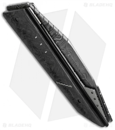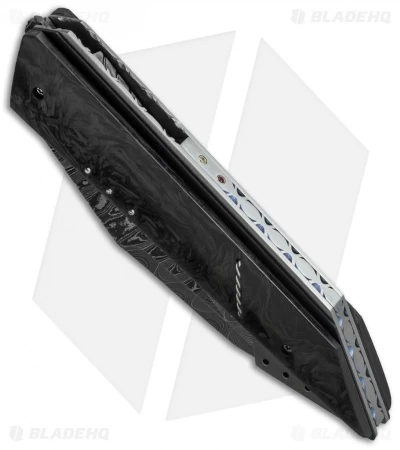 The X-Ploit Flipper is another stellar folding knife design from Corrie Schoeman. This model has a marbled carbon fiber handle over a thin black G-10 scale. The liners and titanium backstrap are filed and feature with Ruby & Citrine inserts on the spacer. The angular wharncliffe style blade is Texas Knives Damascus steel. The action on this knife is super smooth with a ball-bearing pivot and it has an excellent build.