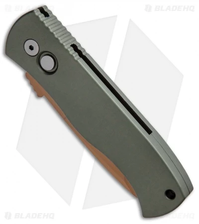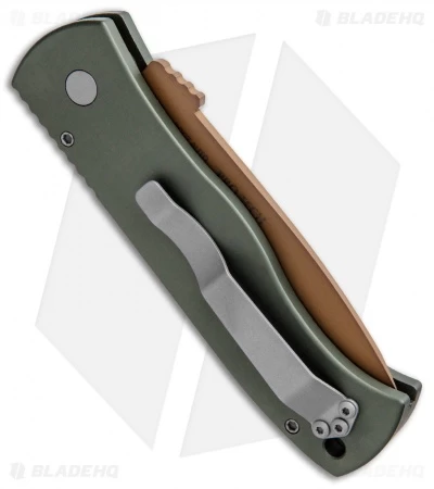 This Blade HQ Exclusive CQC-7 Desert Warrior edition features an OD green anodized aluminum frame. Includes a pocket clip for tip-up carry. The chisel ground tanto blade is copper finished 154-CM stainless steel.