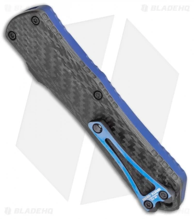 This Manticore-E has a blue anodized handle with a carbon fiber back and a DLC coated recurve blade.