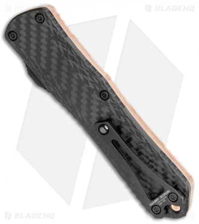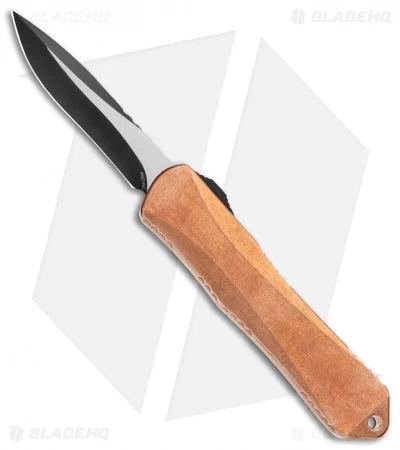 This Manticore-E has a copper and carbon fiber handle. Over time the copper will acquire a beautiful patina. It also features a DLC coated recurve blade.