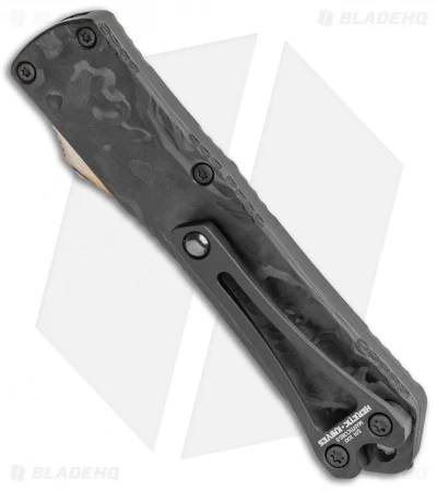 This model of the Manticore-S comes equipped with a hand-ground satin finished blade and a black aluminum handle with marbled carbon fiber and titanium hardware.