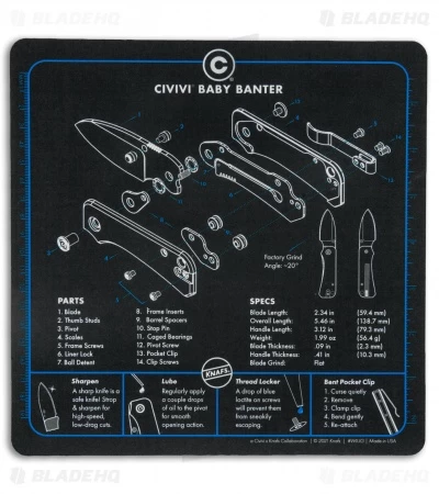 This KNAFS shop mat has a breakdown of everything you need to know about your new Baby Banter from CIVIVI. It’s sized perfectly for taking apart your smaller EDC knives. This shop mat will help protect your desk top from dings, oils, and other occurrences while completing knife maintenance. You could even use it as a nifty mouse pad!