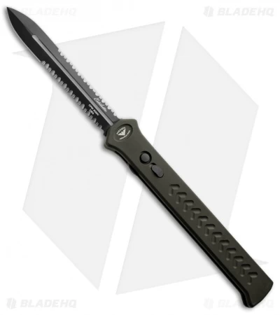This Estilleto knife features a black finished S30V steel double-edge dagger blade with serrated edges. The handle is OD green coated aluminum.
