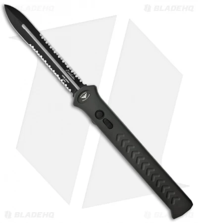 This Estilleto knife features a black DLC finished S30V steel dagger style blade with serrated edges and a sniper grey coated aluminum handle.