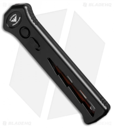 The Paragon PARA-X OTF knife is the next generation of the ATKO-10. This Asheville Steel automatic is a single action out-the-front knife, just push the button and the blade fires out the front of the handle. To close the blade just press the button and use the retracing lever to pull the blade back in. The PARA-X has a sliding safety under the firing button and a pocket clip for easy tip-down carry. Made in the USA and new in box.