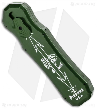 The Piranha Excalibur is a double action out-the-front automatic knife. The action on the Excalibur is solid and reliable. This OTF uses the power of a Piranha in its satisfying and snappy bite. Its handle has textured ridges to add to its uniqueness. This could be your next favorite EDC. With its creative handle style, you are sure to impress anyone who sees it.