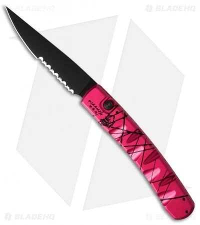 This Virus knife has a black finished blade with a partially serrated edge and pink anodized handle with tactical black finished hardware and pocket clip.