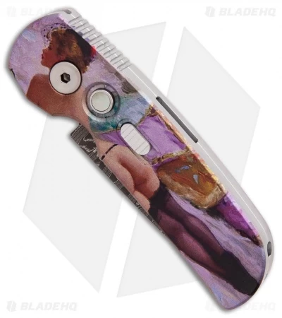 The Pro-Tech Calmigo is a compact automatic knife geared toward everyday carry and general utility. This Custom Calmigo model sports a stout CA legal drop point blade made from Vegas Forge damascus steel. Its handle features a custom anodized Burlesque graphic by Peter Kellet and a mother of pearl push button. The Calmigo is fitted with a sliding safety lock and a deep carry pocket clip, making it a comfortable and secure EDC option.