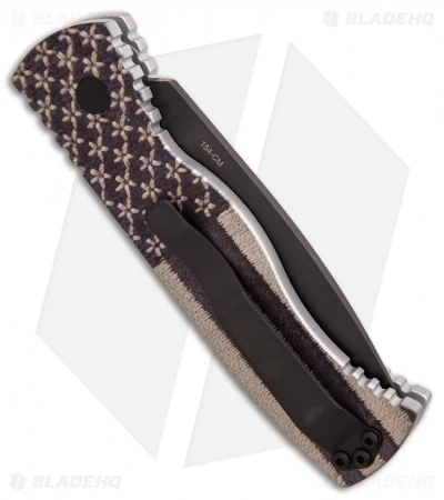 This Peter Kellett print anodized surprise custom TR-2 features a “tactical” American Flag design in a pattern that resembles stitching. The knife is outfitted with black finished hardware and a black 154CM blade.