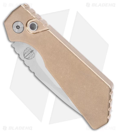 This Strider/Pro-Tech PT auto is equipped with a bronze handle and a mirror finished blade. Fresh from Shot Show 2023, this Pro-Tech Strider collaboration revitalizes their popular SnG automatic model, with a compact EDC design. The Strider inspired profile remains the same, but the handle and blade have been scaled down to a more pocket friendly size. Stonewashed hardware and a black deep carry pocket-clip round out the impressive EDC design.