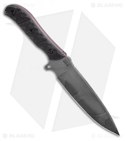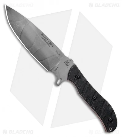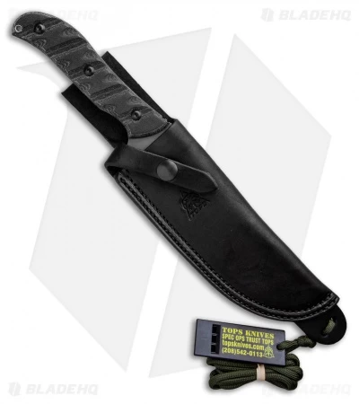 Built in TOPS Knives fashion, the Silent Hero has a 1095 steel blade with an urban camo finish. The handle is fitted with linen Micarta scales with the iconic TOPS Rocky Mountain Tread for an uncompromising all-weather grip. Two lanyard holes, one in the handle along with another in the finger guard, give the user the option to add a safety cord or for lashing to a spear when the situation warrants it. The black leather sheath is durable and looks great paired with this knife. The Silent Hero is held in place with a single snap loop that curls around the finger guard.